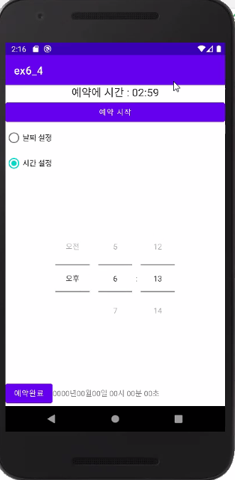 - 예약완료 버튼을 누르면 TextView에 예약 설정한 날짜와 시간을 보여줌
