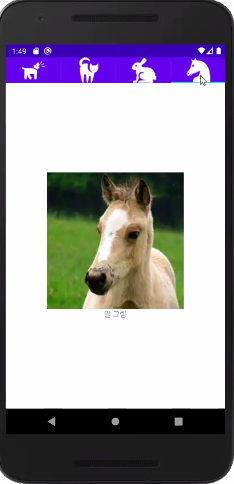 - 상단에 있는 강아지 아이콘 클릭하면 강아지 그림 등장, 고양이 아이콘 클릭하면 고양이 그림 등장. 토끼랑 말도 마찬가지