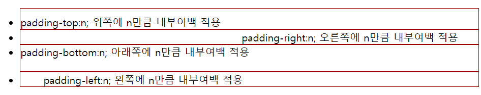 - 위쪽, 오른쪽, 아래쪽, 왼쪽을 방향별로 여백을 줄 수 있다.
