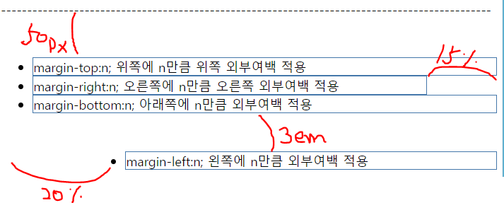 - 위쪽, 오른쪽, 아래쪽, 왼쪽을 방향별로 여백을 줄 수 있다.