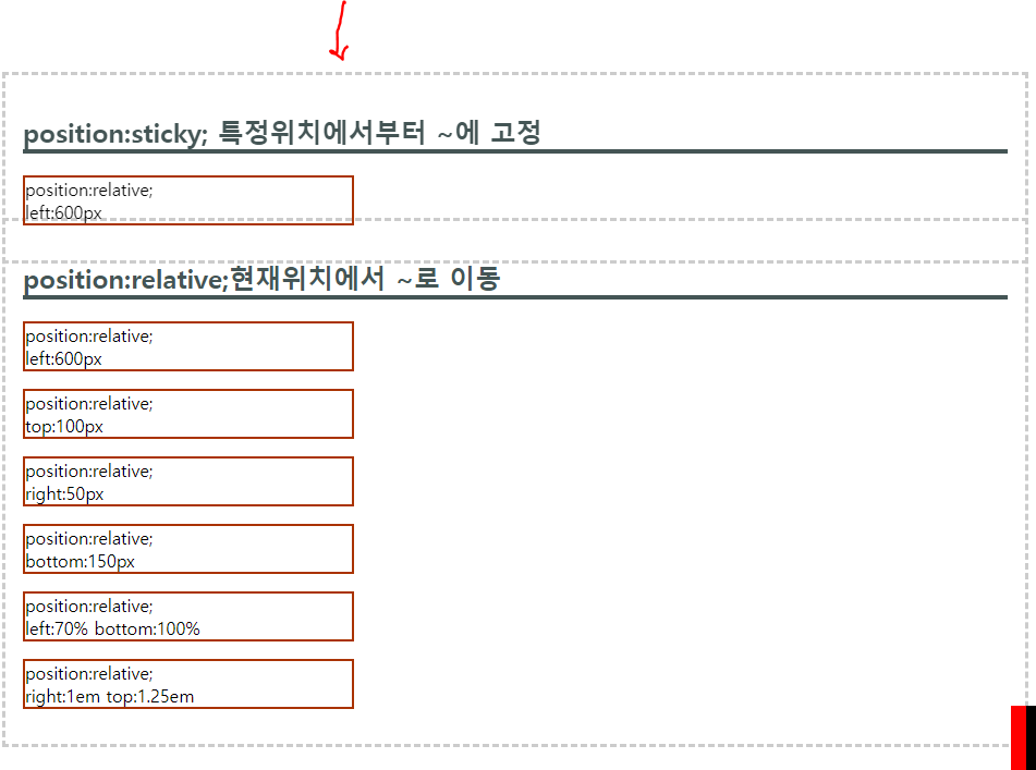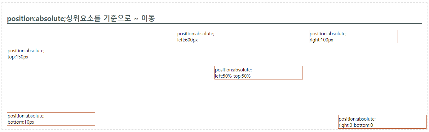 - 가장 가까운 위치에 있는 상위 요소를 기준으로 배치- 상위요소의 position : relative;- 아래 예제에서 상위요소는 section으로 회색 점선 박스라 생각하면 됨