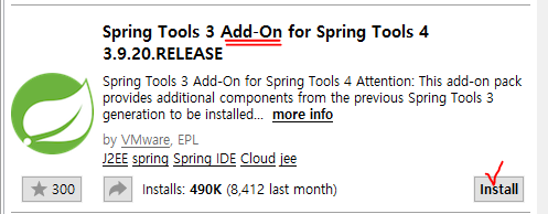 - Help > Eclipse Marketplace > sts ( or spring ) 검색 > Add-On이 있는 Spring Tools 3 설치