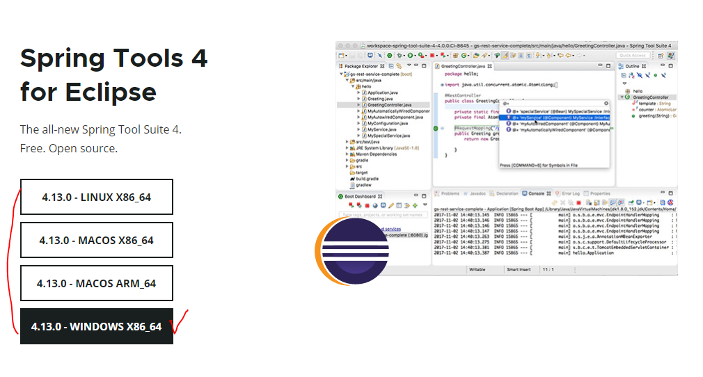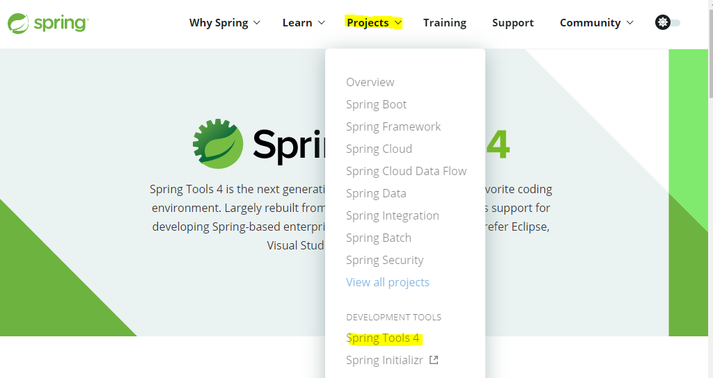 - 위 사이트에 접속해서 상단 메뉴바 Projects - Spring Tools 4 클릭