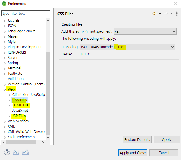 - Web 탭의 CSS, HTML, JSP Files의 Encoding을 UTF-8로 설정