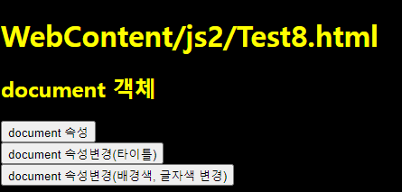 <input type="button" value="document 속성변경(배경색, 글자색 변경)" onclick="fun3();"> <br>