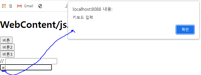 <input type="text" onkeyup="alert('키보드 입력');"> <br>