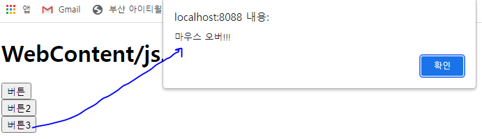 <input type="button" value="버튼3" onmouseover="aler('마우스 오버!!!');"><br>