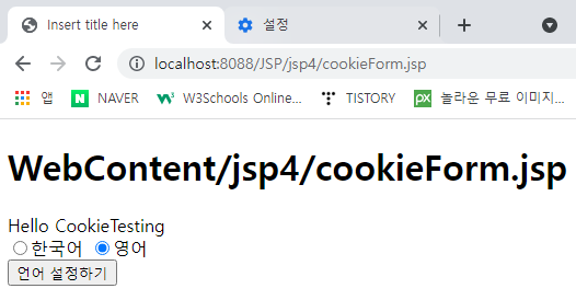 // 3) 한국어면 - "안녕하세요 쿠키연습중", 영어면 "Hello CookieTesting" 화면출력하기