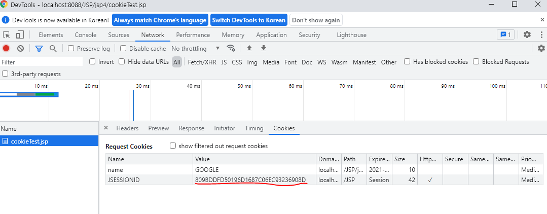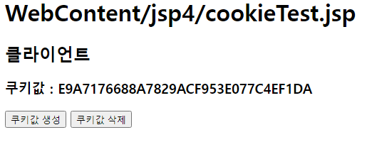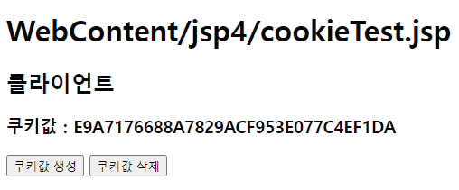 - 쿠키값 생성 버튼 클릭하면 cookieSet.jsp에서 생성했던 쿠키이름 출력됨