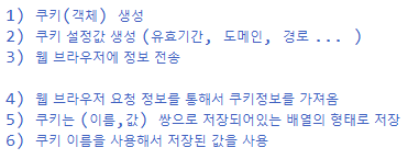 - 쿠키는 이름, 값, 유효기간, 도메인, 경로 등으로 구성