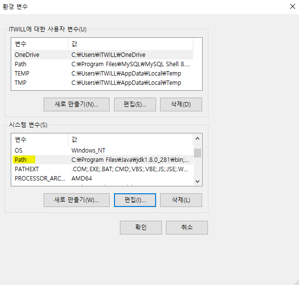 - 시스템 속성 창 아래 환경변수 버튼 클릭