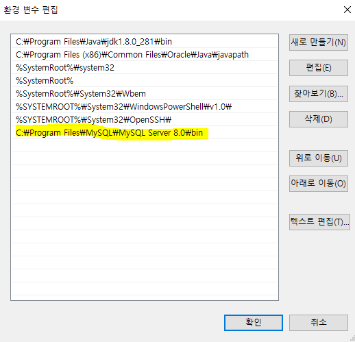 ※ mysql입력시 실행되지 않는다고 하면 환경변수 설정이 필요함
