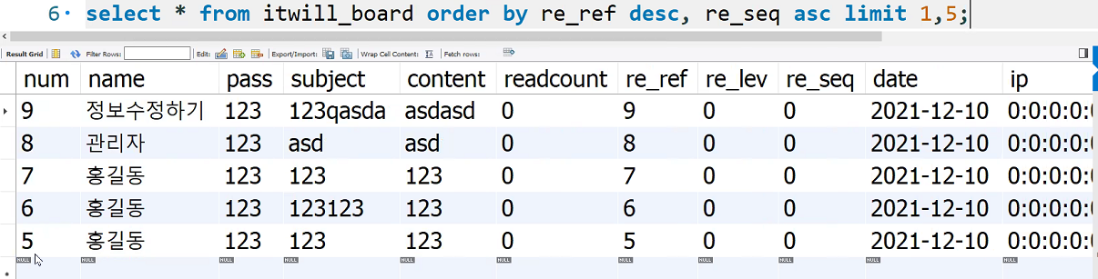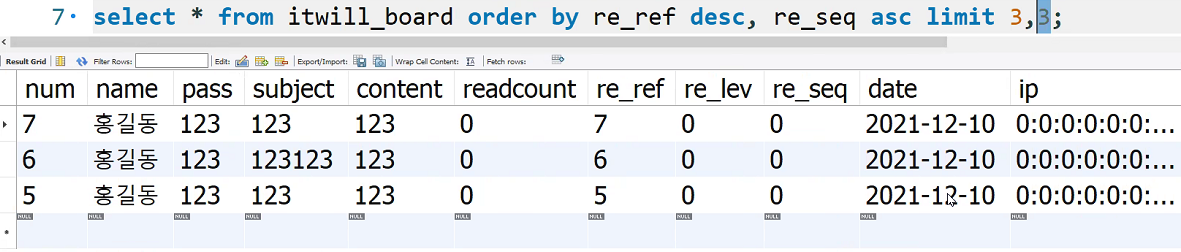 sql = "select * from itwill_board order by re_ref desc, re_seq asc limit ?,?";