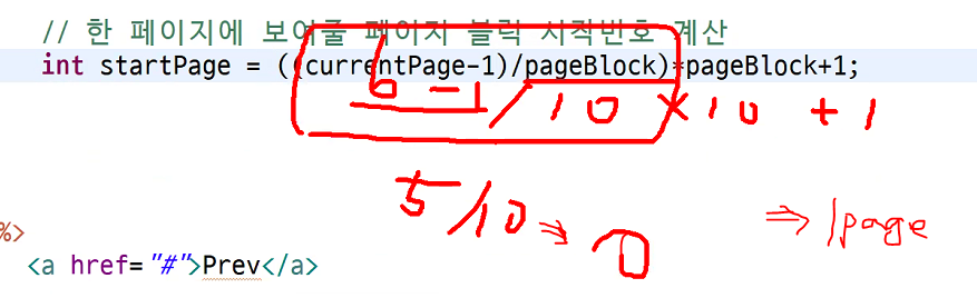 int startPage = ((currentPage-1)/pageBlock)*pageBlock+1;